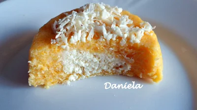 Am dat deoparte și am umplut formele de silicon până la jumătate, am pus o bucată de caș și apoi am adăugat din nou balmoș, până la umplerea formelor.